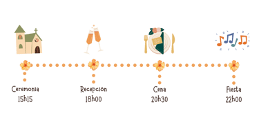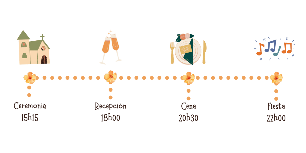 Una alegría que queremos compartir con vosotros, familiares y amigos, celebrando juntos nuestro amor. Desde la tarde hasta la noche, el día de nuestra boda transcurrirá así: